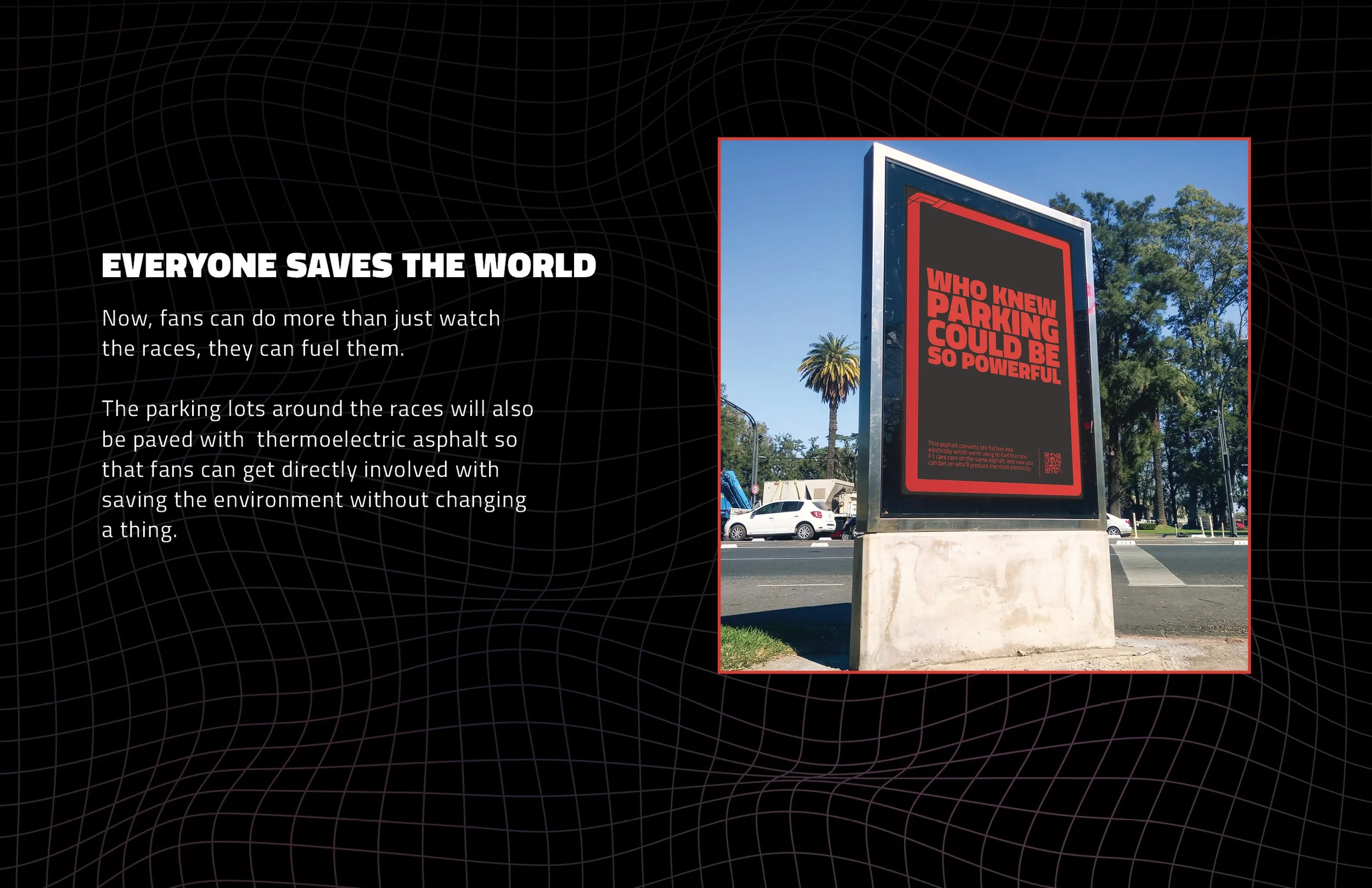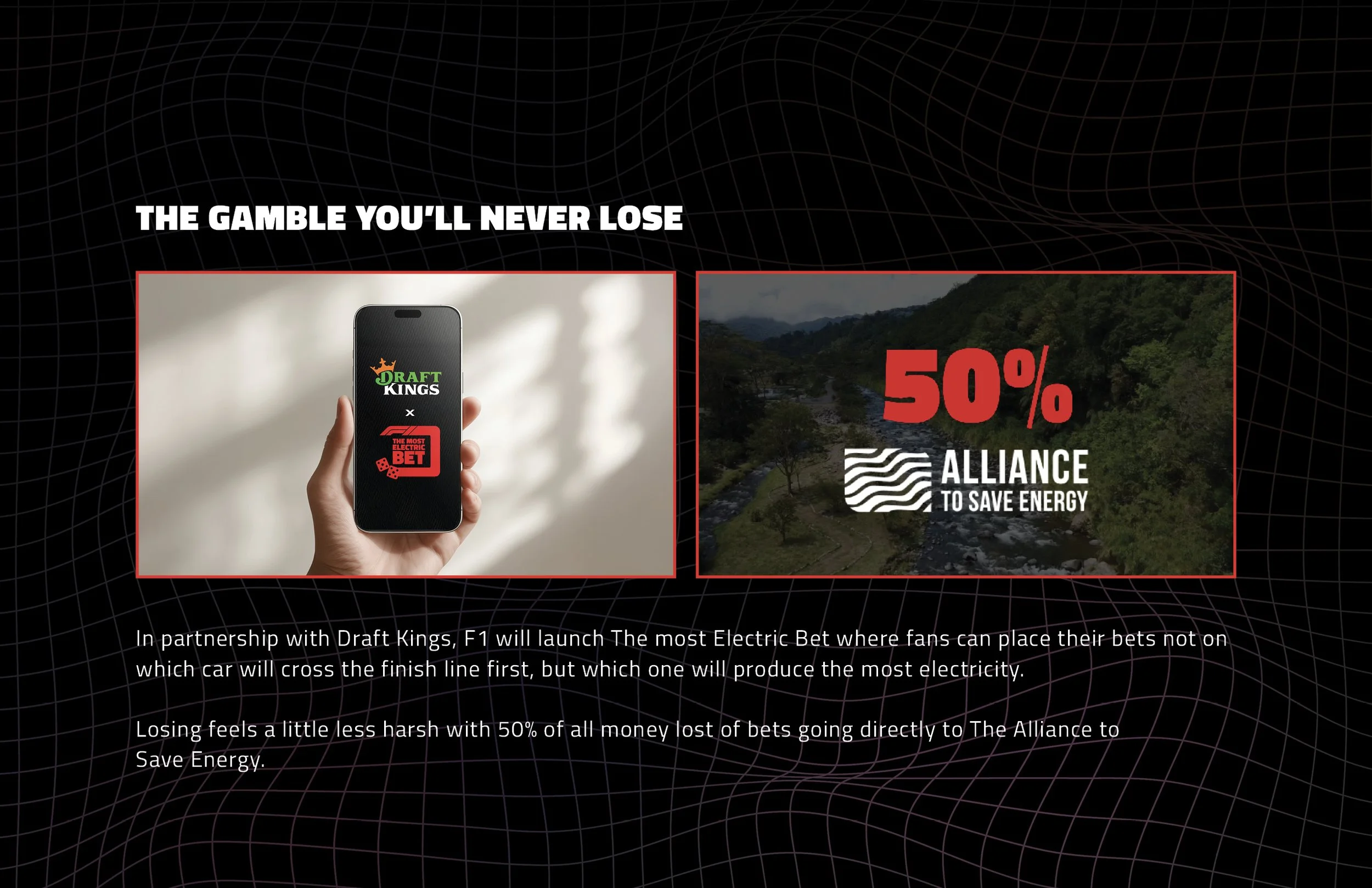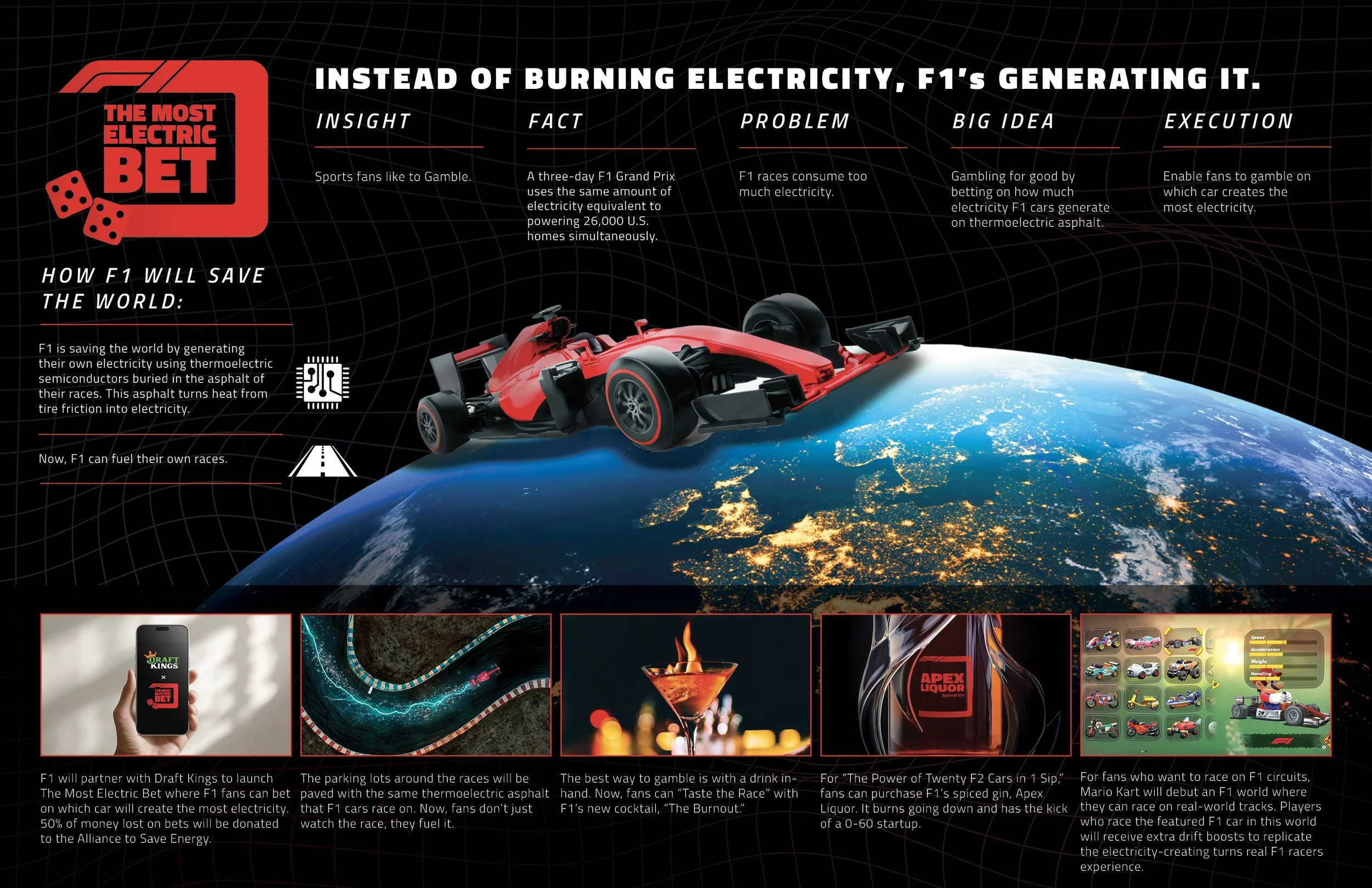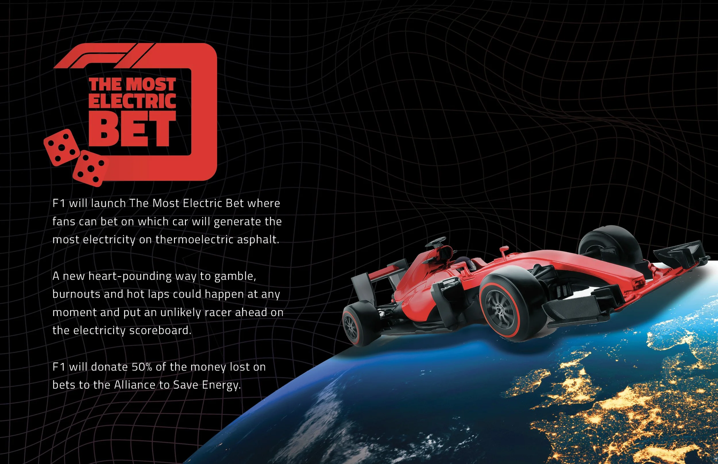 Big Idea: Gambling for good by allowing people bet on how much electricity F1 cars generate.